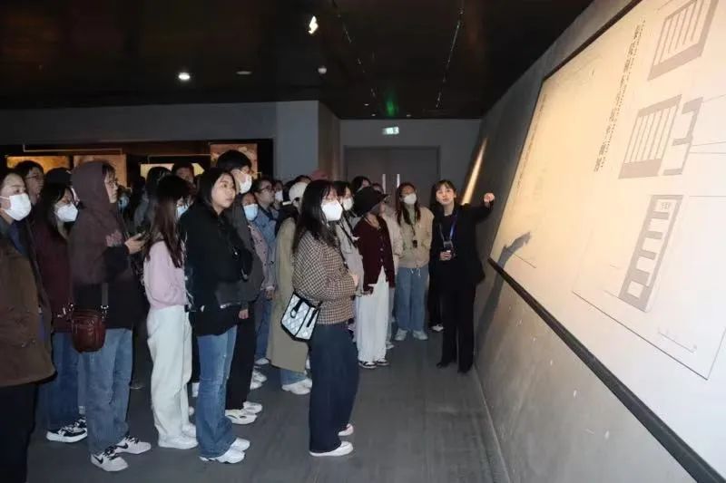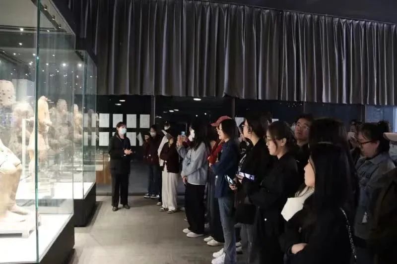 同学们首先前往的便是丽山园区。丽山园区内现有两个考古现场展示陪葬坑,分别是K9901号陪葬坑和K0006号陪葬坑。其中,命名为K9901号陪葬坑的“百戏俑坑” 位于秦陵东南部内外城之间,1999年3月,秦始皇陵周边还都是农田和村庄,在秦始皇帝陵封土东南部内外城垣之间的村民院子里发现了火烧土,据此线索发现了一个总面积约800平方米的“凸”字形陪葬坑,命名为K9901号坑。在1999年3月,秦始皇陵考古队曾对这一陪葬坑进行过抢救性试掘,出土了目前在秦陵地区发现体积、重量最大的一件 青铜鼎 ,并出土陶俑11件。坑中出土了11个不同于兵马俑的新类型陶俑,全部上体裸露,下着彩色短裙,与真人一般大小,姿态各异,被认为可能是供秦始皇娱乐的百戏艺人,同学们通过参观此坑道,基本了解了秦朝工匠的服饰、工具、分工,对当时的秦代生产体系有了清晰的认知。K0006也是一座地下坑道式土木结构建筑,由斜坡道、前室和后室组成,呈东西向的中字型,总面积471平方米。作为唯一没有受到人工破坏的陪葬坑,这里保存的很完整,主要是自然风化坍塌,所以在这里可以看到秦代陪葬坑的大致原貌——同学们在此了解了考古人员还原的秦朝车马器具,其中,“铜车马”的展出,让同学们对秦代发达的御马技术、出彩的工具设计有了新的理解。