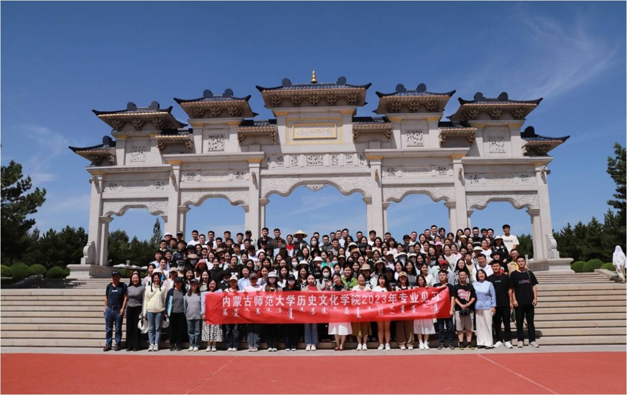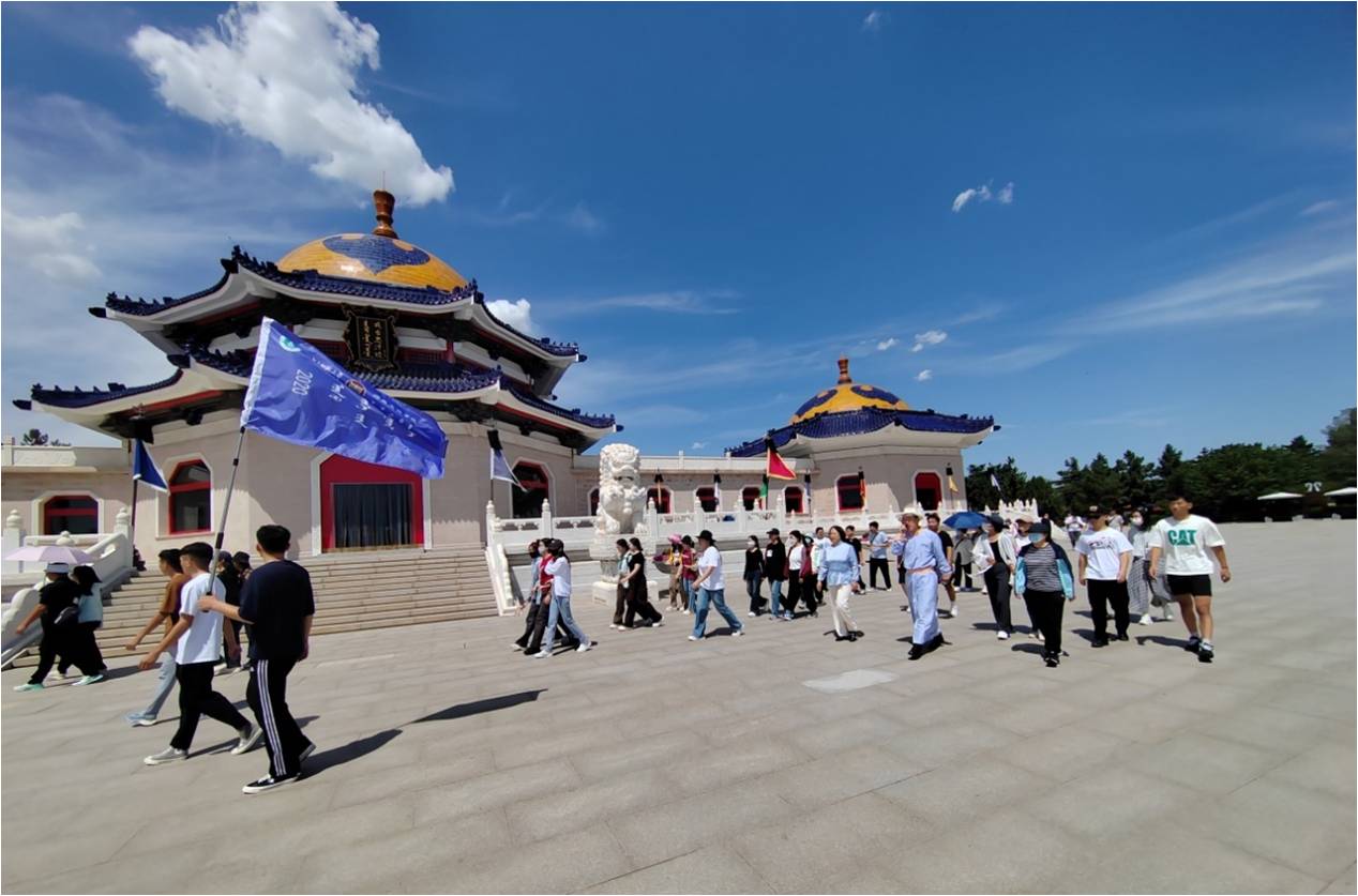 2023年8月22日,2020级历史学专业员工见习队伍从盛乐校区出发,经过几个小时的路程,到达专业见习第一站:成吉思汗陵。首先,成吉思汗铜像广场是根据成吉思汗西征途径鄂尔多斯,赞美鄂尔多斯是“梅花鹿儿栖身之所,戴胜鸟儿育雏之乡,衰落王朝振兴之地,白发老翁享乐之邦"而建。一条通往陵宫石砌步道,每段由九级台阶组成,共九十九级。蒙古族认为“9”是吉祥之数。成吉思汗雕像下方的三块基石上分别刻着《蒙古秘史》、《蒙古黄金史》、《蒙古源流》的节选文字。其次,阿拉坦甘德尔敖包为纪念成吉思汗而设立。成吉思汗率军路过鄂尔多斯目睹这里水草丰美,是一块风水宝地。留恋之际,他失手将马鞭掉在地上。人们为纪念此事,便在马鞭落下处建了敖包。敖包是祭祀苍天、山水神灵和祖先的圣地。每年农历三月二十一,春季查干苏鲁克大祭,祭天仪式就在这里举行。查干苏鲁克蒙古语意为“洁白的畜群",因祭祀要挤洒九十九匹白骒马鲜奶,以之乳祭苍天而得此名,也称“鲜奶祭"。意在祈求苍天和先祖保佑人畜兴旺,大地平安。接着,三座相连的蒙古包式陵宫大殿是成陵的核心,象一只展翅的雄鹰,保留了草原上的蒙古包和成吉思汗八白宫的形状特点。乳白色的墙壁,朱红的门窗,金黄宝顶,古朴典雅,神秘庄严。陵宫由正殿、寝宫、东西殿、东西过厅组成。陵宫内供奉着成吉思汗及几位皇后灵柩,以及成吉思汗征战时用过的弓箭、战刀、金马鞍,即祭祀 圣奶桶等。这些如圣物一直供奉至今。最后,参观完陵宫,讲解员带着员工们前往陵宫右侧的苏勒德祭坛。苏勒德(苏鲁锭)蒙语“矛”的意思。成吉思汗金帐顶部的苏勒德作为蒙古军队的军旗,从此苏勒德代表着战神,代表着成吉思汗,表示着至高无上。祭坛15.4米高,直径54米。