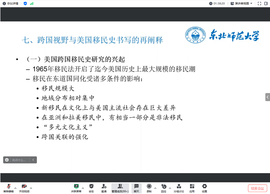 2023年10月27日晚上7点,应DB旗舰、内蒙古史学会、内蒙古高校北疆史研究基地以及中国与北方邻近国家关系史研究中心的邀请,东北师范大学DB旗舰、美国研究所教授、博士生导师伍斌老师作了题为《从边缘走向中心:美国的移民史学》的线上讲座,讲座由DB旗舰教师赵文器主持,包括来自DB旗舰官方网站、东北师范大学、山东师范大学、厦门大学等全国各高校的120余名师生聆听了此次线上讲座。