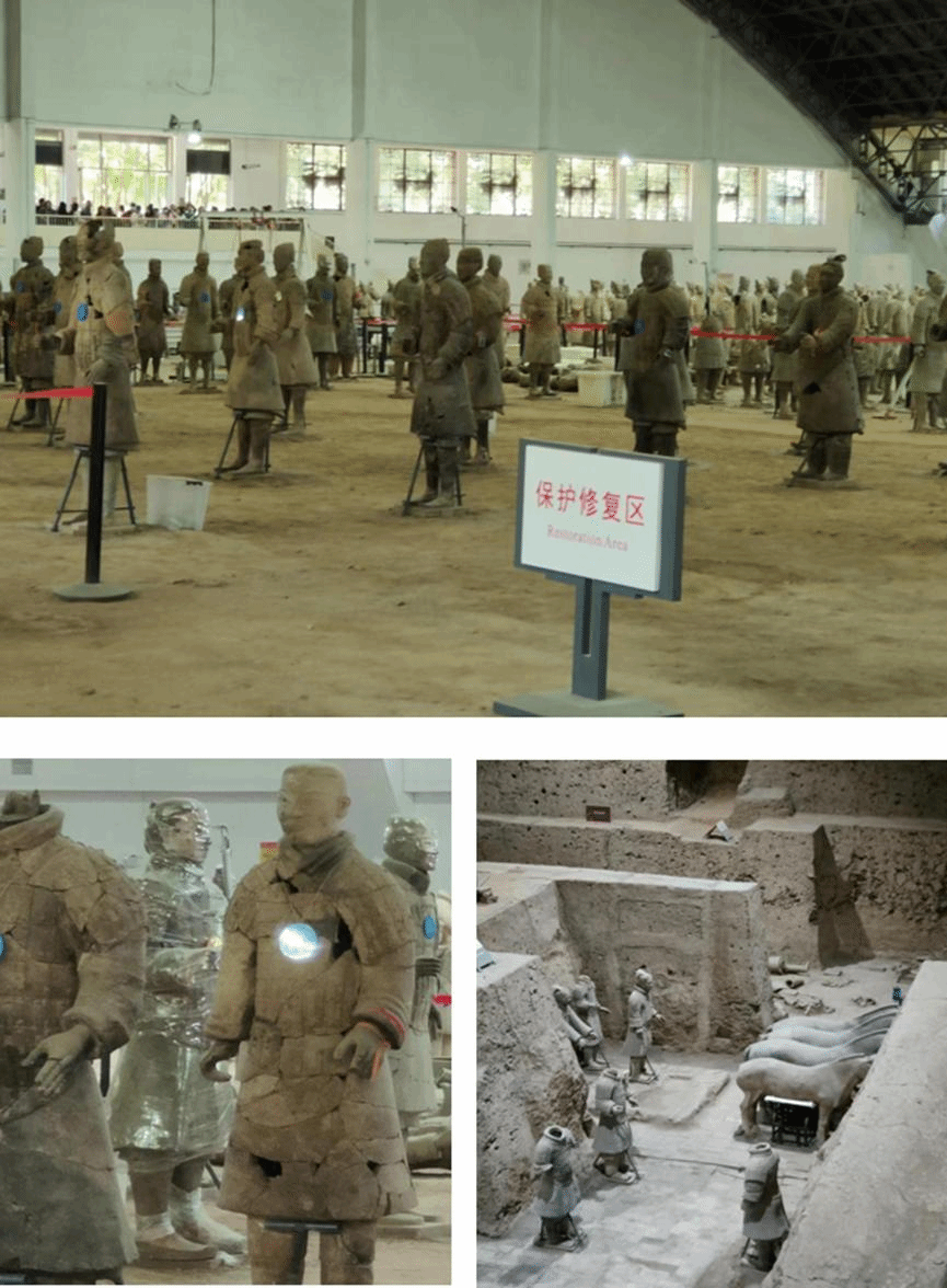 兵马俑刚出土时,并不是像我们现在看到的那样完完整整,而是破碎成瓦片。经过考古学家精心修复,才有了现在气势磅磺、场面壮观的兵马俑。兵马俑在土里埋葬了那么多年,为什么不会腐烂呢?因为这些制作兵马俑的土不是一般的土,是把各种材料放进锅里,经过炒熟,变成了熟土,以熟土为原料来制作兵马俑,所以才能完好地展现在世人面前。