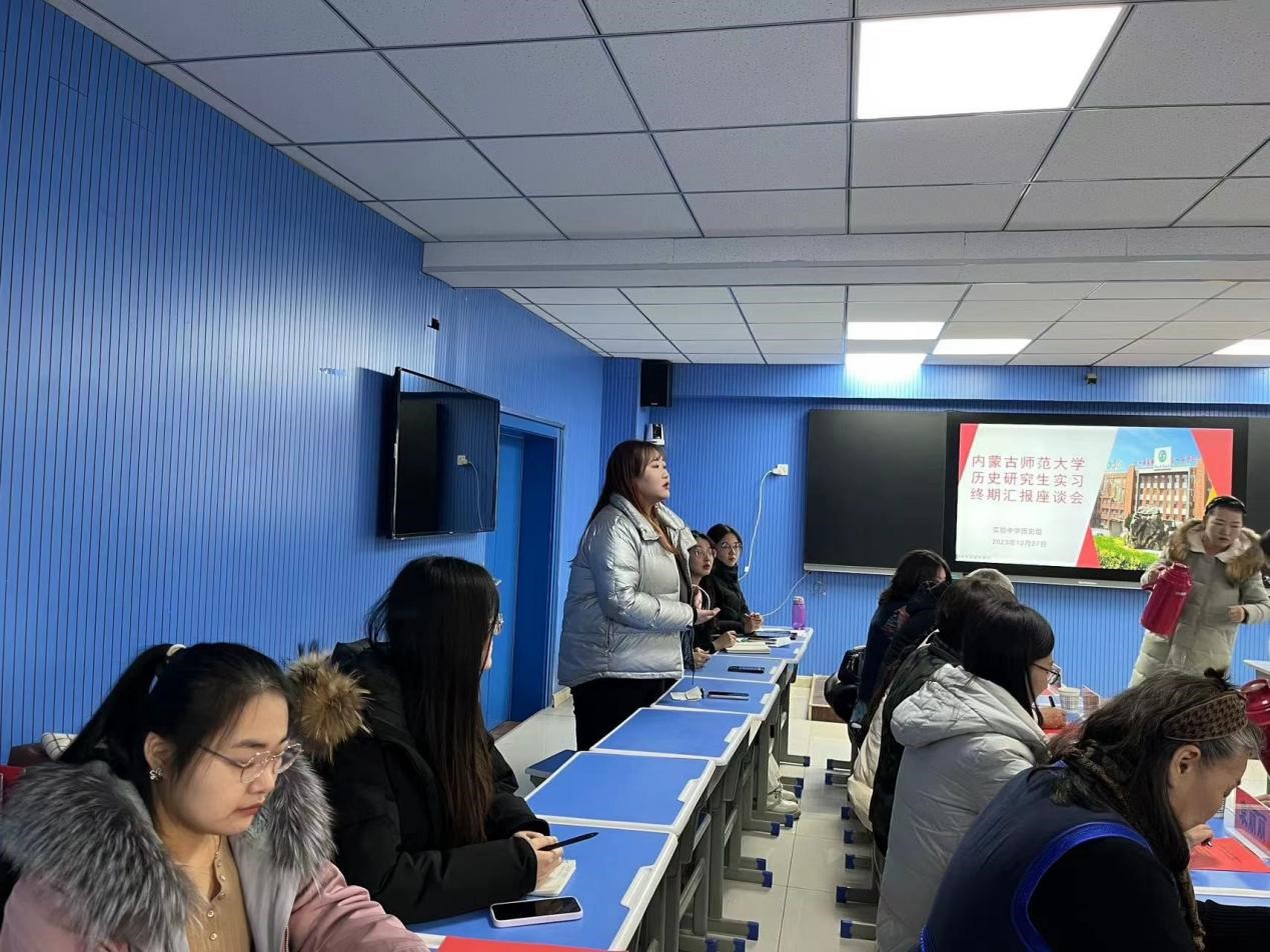 2023年12月27日上午,2022级学科教学论(历史)部分研究生在呼和浩特实验中学鼓楼校区实习终期汇报座谈会议顺利召开。呼和浩特实验中学参加会议的有苗琪俊、齐涛、张寒峰三位副董事长、教务处白杰主任,以及历史组全体教师,DB旗舰参会老师有:党委书记李艳洁、研究生导师郭永胜教授、乌兰其木格教授、王洁副教授、袁丽丽副教授、苏日古嘎副教授,以及赴实验中学实习的研究生。