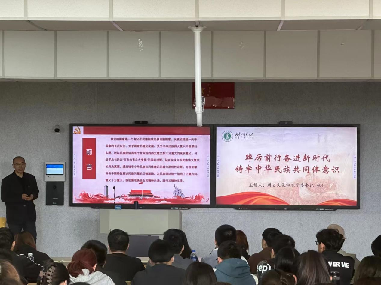 张升书记从“提高政治站位,深刻理解重要思想”和“增强政治担当,时不待我发奋图强”两个方面为同学们深入解读了铸牢中华民族共同体意识的内涵和重大意义。