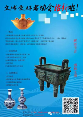 如果你向往《盗墓笔记》中玄幻的探秘之旅,那么请加入文博爱好者协会,我们一起探寻千年古墓的遗迹,亲历真实的考古发掘。如果你热爱历史,喜欢文物,那么请加入文博爱好者协会,我们一起交流所学所悟。如果你关心文物保护现状,想要参与真实的文博保护,把握文物鉴定的方法,那么请加入文博爱好者协会,我们一起实践、探索,共同收获。又或者你想要与博物馆有更近的距离,那么请加入文博爱好者协会,你将有机会成为我们的讲解员、有机会亲自参与各种文物专题展览、甚至有机会与文保界牛人畅谈。