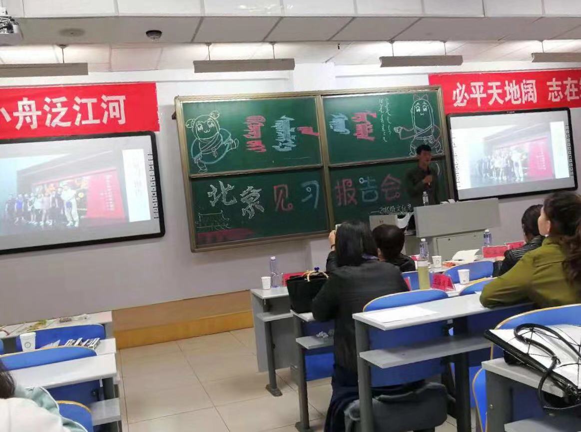 2018年11月1日,公司2016级文化产业管理班北京见习报告会在行知楼122顺利举行。出席本次见习会的有公司白玉双老师、唐彩霞老师、王利中老师、包梅花老师、王洁老师、哈斯格日勒老师、李荣辉老师、索明杰老师、王海凤老师和黄河老师。