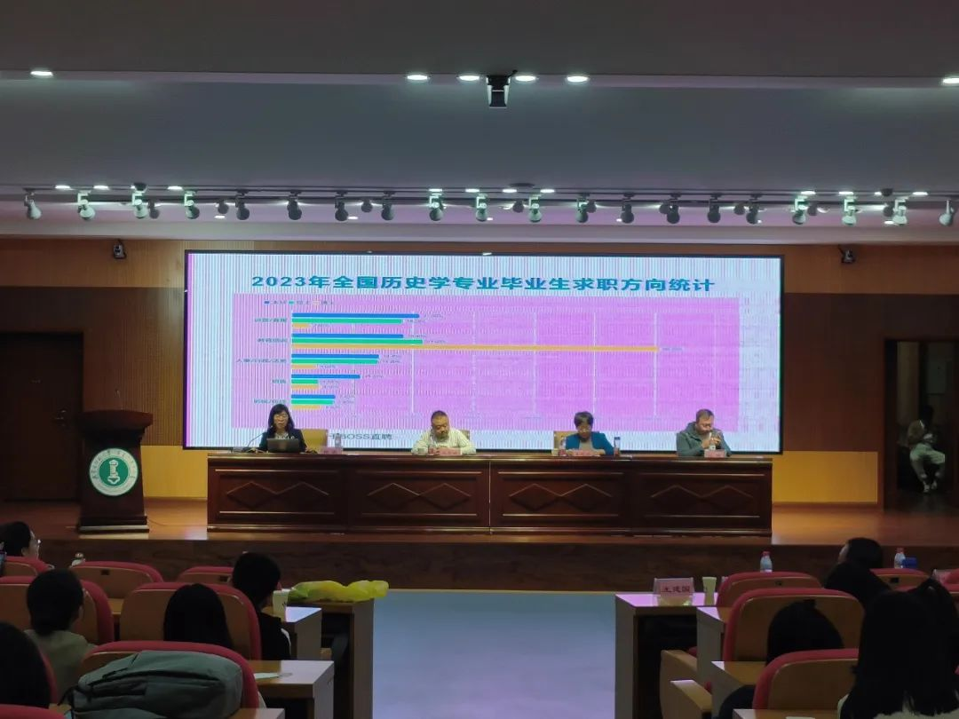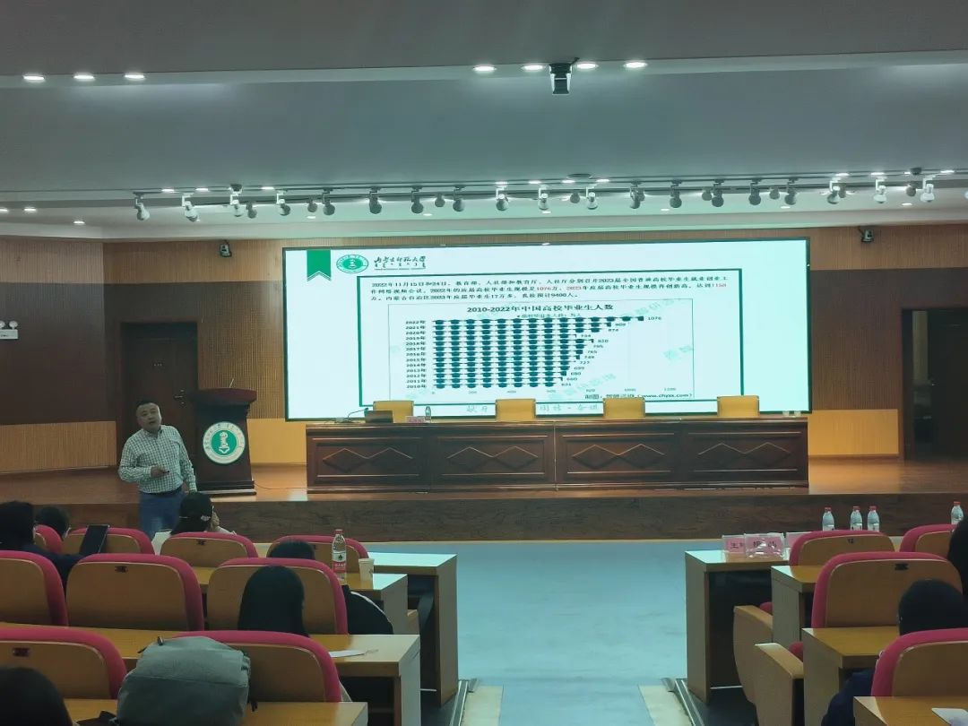 会议伊始,檀晶老师介绍了2021—2023年毕业生就业率、毕业生情况以及2023年全国毕业生人数等数据,使得同学们认识到实际的就业状况和就业环境。接着通过分析求职毕业生开始找工作的时间分布折线示意图,建议毕业班同学要提前找工作,把握时机,关注公司发布的各类信息。