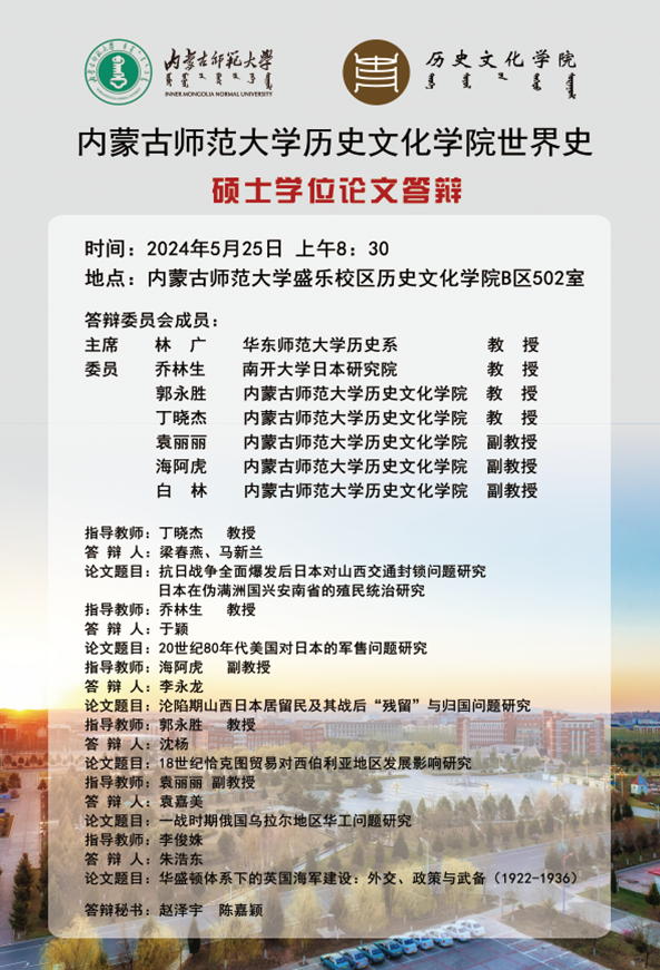 2024年5月25日上午,DB旗舰官方网站盛乐校区公司楼502会议室迎来了DB旗舰2021级世界史硕士学位论文答辩会。此次答辩会旨在检验研究生的学术研究水平和综合素质,并邀请了多位学术界权威人士担任评审,进一步保证答辩的高质量和公正性。