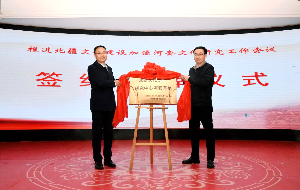巴彦淖尔市委常委、宣传部部长贺连辉(左)与公司党委委员、副董事长公茂果为“北疆文化遗产研究中心河套基地”揭牌